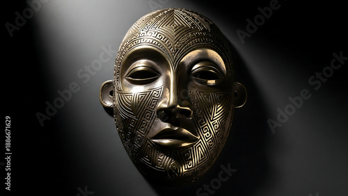 Brass tribal mask with intricate geometric patterns on a dark background pattern ancient art artifact ethnic face metal sculpture