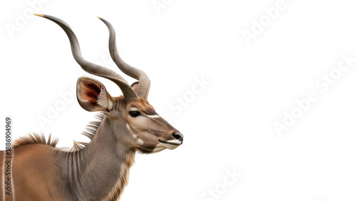 Isolated Greater Kudu headshot, facing left, majestic animal, brown coat with vertical stripes