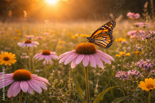 Motyl siedzący na kwiatku w letniej łące o złotym zachodzie słońca