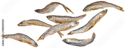 Falling small dried fish isolated on white background, salty anchovy, full depth of field