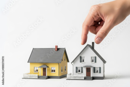 Hand choosing between two miniature house models on white background, concept of real estate decision, home buying, or property selection