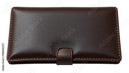 Closed luxurious dark brown leather wallet or small notebook case featuring contrasting orange stitching and a secure snap closure on transparent background