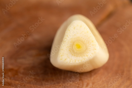sliced purple garlic scattered on the black kitchen table and peeled and sliced fragrant fresh and natural garlic spices scattered on the kitchen table during cooking