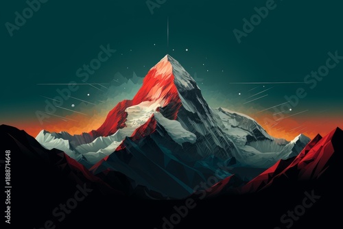 Breathtaking mountain landscape with snow capped peak bathed in warm sunset light and shooting stars, creating a magical and awe inspiring scene