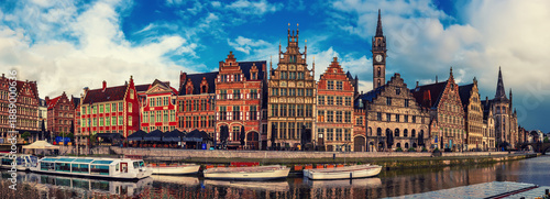 Ghent city historical center, tourists boats and colorful buildings on Leie river bank, Belgium