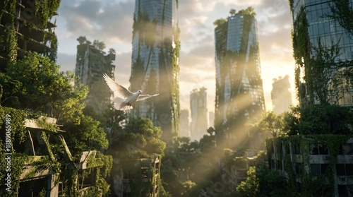The skyline of an abandoned, overgrown metropolis, reclaimed by nature.