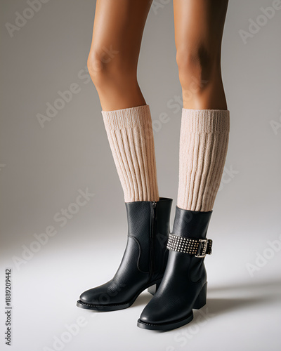 Czarne skórzane kozaki na obcasie z paskiem i beżowymi getrami na nogach kobiety.
