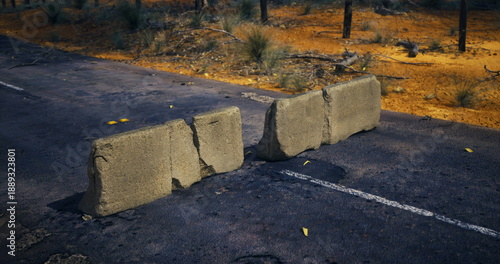 concrete barriers blocking rural road, cracked asphalt, golden dry grass, scattered leaves, roadside trees in warm dusk light makeshift blockade suggests human
