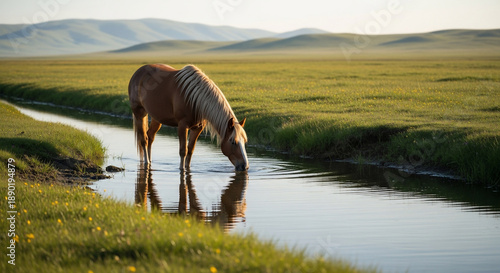 Horse Drinking in Nature: A solitary horse finds solace, bending to quench its thirst from a pristine stream amidst a picturesque meadow under a clear, open sky.