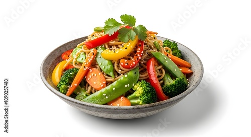 Delicious asian noodle stir fry with colorful vegetables isolated on white background
