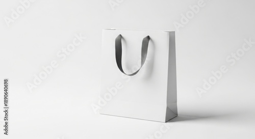 Minimalist white paper shopping bag with a gray ribbon handle, isolated on a clean white background. Represents retail, gifting, and product packaging.