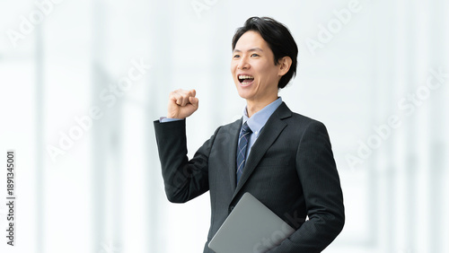ガッツポーズで成果を喜ぶ日本人ビジネス男性, Japanese business man celebrating success with a fist pump
