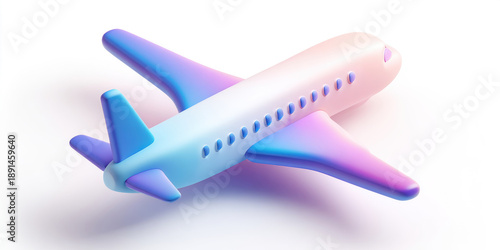 3D render of a stylized airplane with iridescent wings and fuselage on a white background. A minimalist 3D airplane model with smooth, rounded edges and a gradient color scheme, perfect for travel.