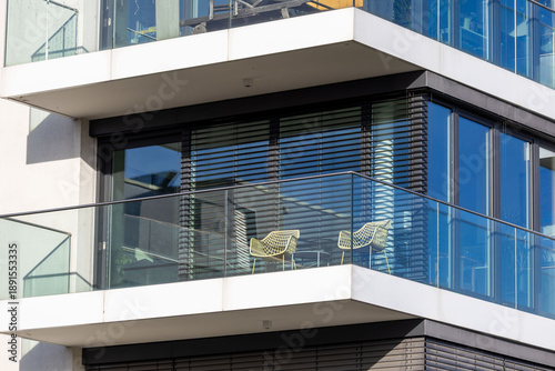 Moderne Jalousie bzw. moderner Raffstore am Fenster eines neuen Wohnhauses