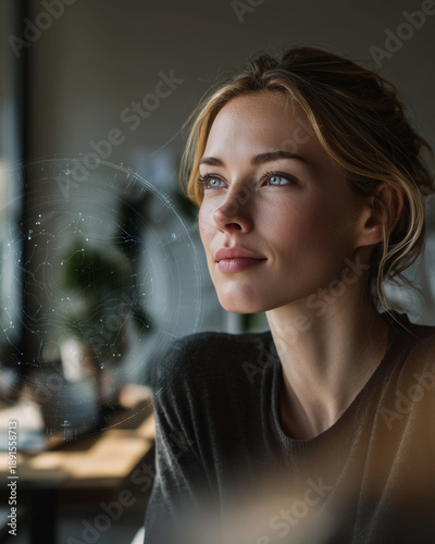 Ritratto intimo di ingegnera/ricercatrice davanti a UI olografica: texture reali, luce di finestra e neon, mood contemplativo, storytelling su AI e innovazione responsabile.