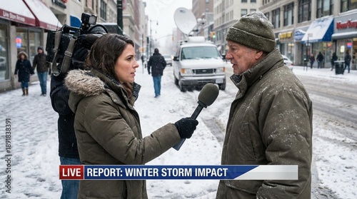 Female reporter interviewing man about winter storm on snowy street