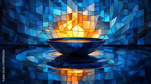 Stained glass window panel featuring a symbolic baptismal font as a glass basin, abstract gold shapes