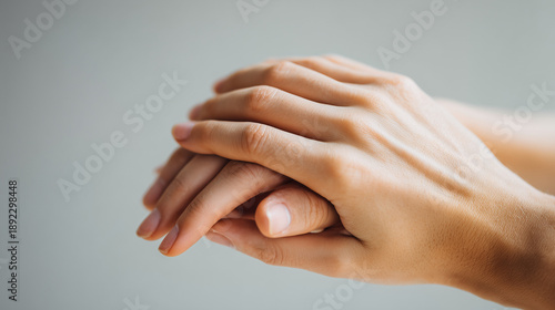 A high-quality close-up of hands gently protecting and covering another hand, creating a powerful symbol of trust, care, support, and emotional connection on a neutral background.