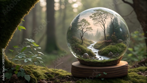 Glass sphere containing miniature forest, fantasy realism concept