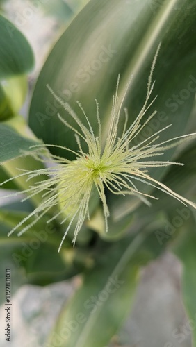 Close-up of green corn flower with long, thin stamens