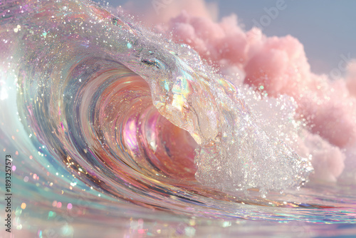 Wave ocean barrel breaking pink glitter sea foam sparkle spray shimmering majestic serene energy power beauty nature magical coastal liquid fluid landscape scene surreal dreamlike atmosphere
