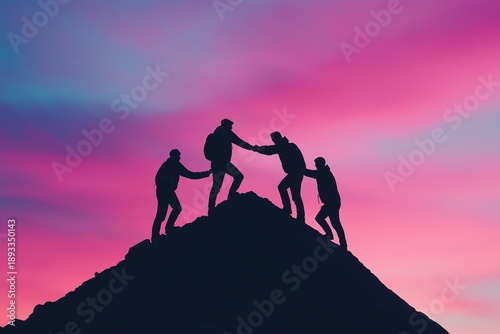 Four people silhouetted against a colorful sunset sky, collaborating and helping each other hike up a mountain