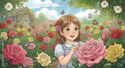 Girl in Rose Garden - A Childs Delightful Day Among Flowers.