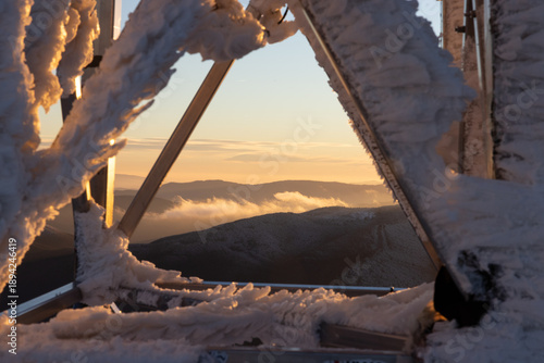 Malowniczy zachód słońca w zimowych Bieszczadach, góry pokryte śniegiem o złotej godzinie.