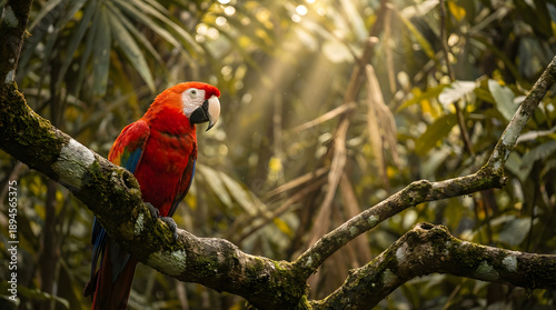 Scarlet Macaw in Lush Jungle, Wildlife Photography, Natural Habitat, Vibrant Environment, Close-Up View