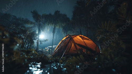 Illuminated orange tent stands resiliently amidst a heavy nighttime downpour in a lush, dark jungle, offering a solitary refuge during a wet outdoor adventure