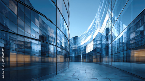 Modern glass architecture curves create a futuristic urban environment with reflection