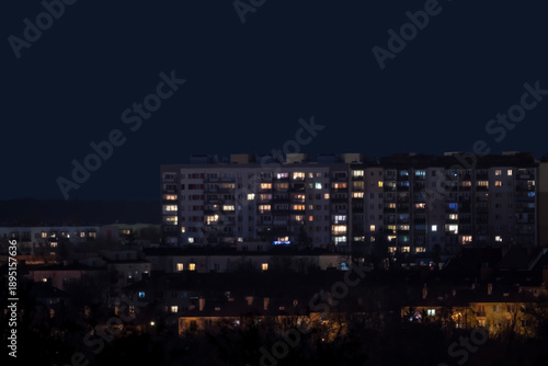 Ostrowiec Świętokrzyski zimową nocą urzeka oświetlonymi budynkami mieszkalnymi. Ciemne zimowe niebo kontrastuje z rozświetlonymi oknami, podkreślając geometryczną strukturę wieżowców.