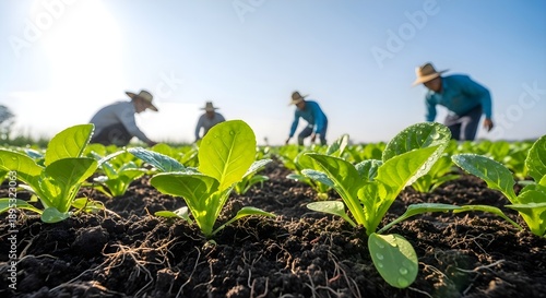 Sustainable Organic Farming: Group of farmers working in green vegetable field under bright sun, agricultural labor, fresh crop growth, rural plantation, food production and nature concept