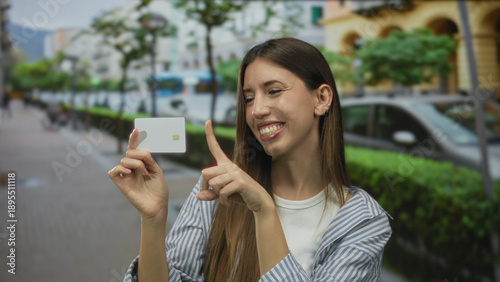 Woman holds creditcard with finger pointing to card while smiling broadly on a bustling city street with parked cars in view; confidence ease simplicity.