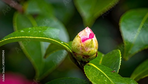 A pink camellia bud emerges amidst lush green leaves, hinting at the bloom to come, against a softly blurred background