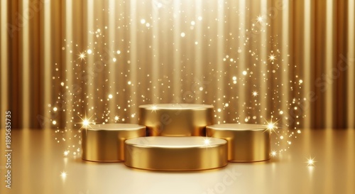 Elegant Golden Product Display Podium with Sparkling Light Effects.