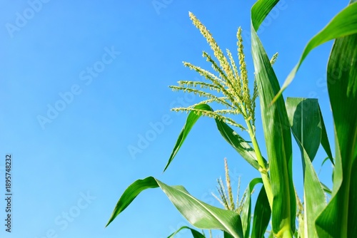 Corn plant with tassels against blue sky