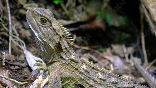 Tuatara Sphenodon reptile extant lineage of Rhynchocephalia with head out of burrow in Wellington New Zealand Aotearoa