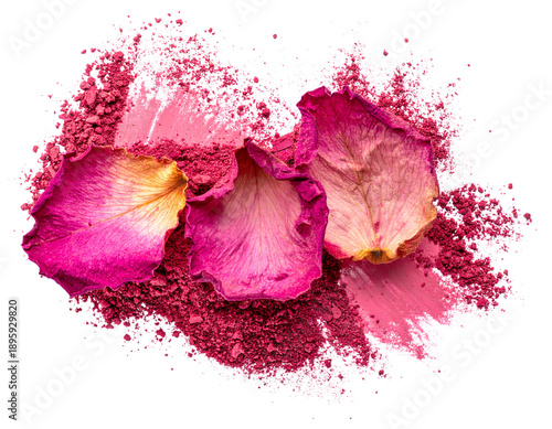 Three dried rose petals shattering into fragrant floral pink and red herbal spice powder dust, isolated on a transparent background, PNG