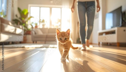 Ginger kitten walking toward the camera in a sunlit living room with a person approaching from the background