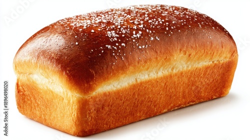 Golden brown brioche bread loaf with sugar topping on white background.