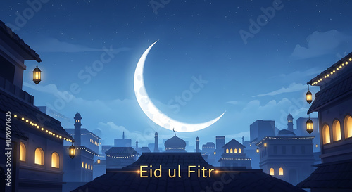 Eid ul Fitr celebration with crescent moon over mosque rooftops at night