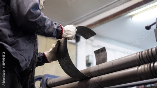 Skilled metal worker shaping metal sheet using industrial rolling machine for fabrication. Demonstrating precision and expertise in workshop environment