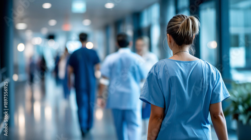 Healthcare workforce gaps concept, faceless medical professionals in defocused hospital corridor, staffing challenges, care delivery, population health needs, with copy space
