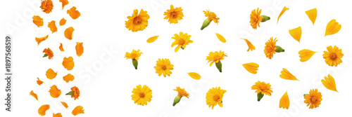 Set and collection of bright orange calendula flowers and medicinal marigold petals falling in various patterns isolated on white transparent PNG background