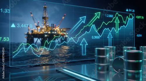 Crude oil barrels and offshore rig platform with digital market chart showing price rise and energy growth, business finance concept of increasing petroleum stock trade value.