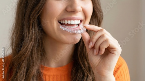 Smiling young woman putting clear plastic aligner on teeth for orthodontic treatment plan