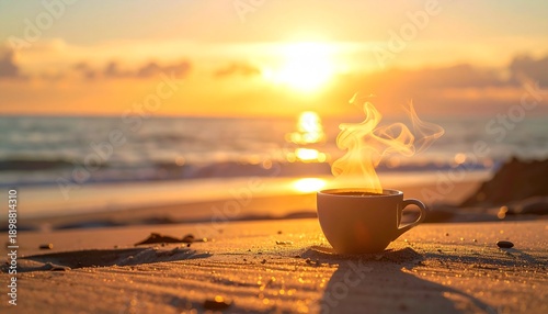 Una taza de café humeante reposa en la arena frente a un atardecer dorado sobre el océano, creando un momento de paz y calidez.