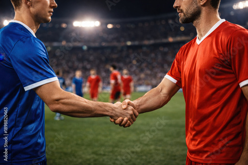 Soccer players in red and blue uniforms shaking hands on a stadium before a match. Concept of fair play, sportsmanship, competition, teamwork and professional football.