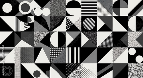 Monochrome abstract pattern of geometric shapes and textures, in various arrangements
